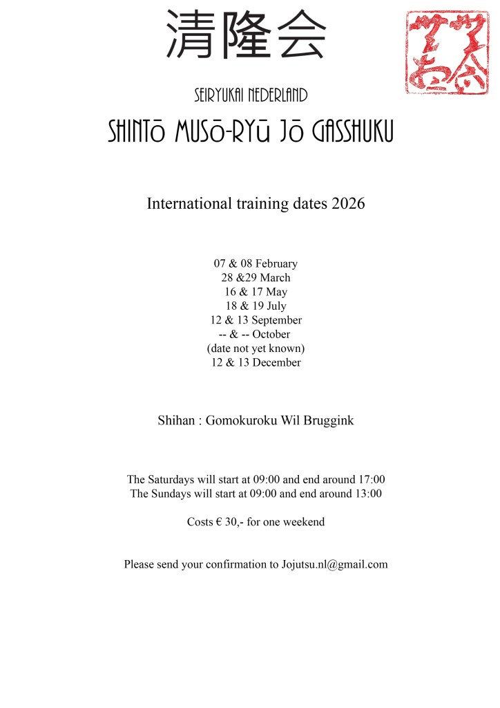 Zeer geslaagd gasshuku onder leiding van Kees Bruggink sensei waarin veel aandacht was voor de basisprincipes van Seiryukai jo en Shinto ryu kenjutsu. Daarbij kregen vier deelnemers een Oku-iri uitgereikt na jaren van beoefening. Alle deelnemers bedankt!